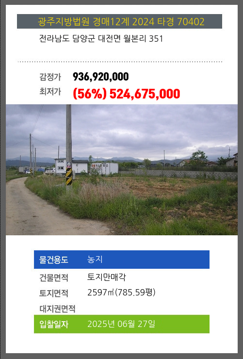 | 토지면적 | 2597㎡ (785.59평) | 소유자 | 농** | 보증금 | (10%) 52,467,500 |
