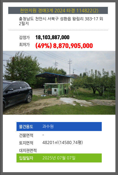 | 용도 | 과수원 | 채권자 | 농** | 감정가 | 18,103,887,000 |