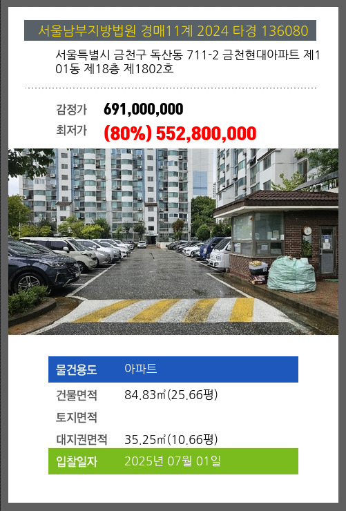| 건물면적 | 84.83㎡ (25.66평) | 채무자 | 김** | 최저가 | (80%) 552,800,000 |