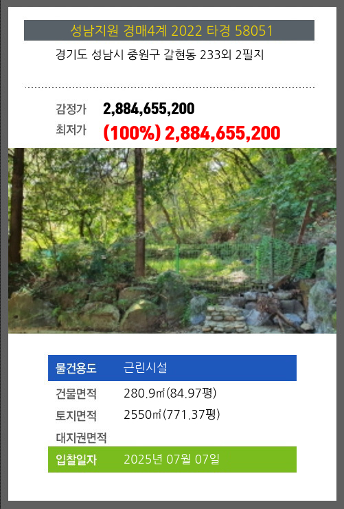 | 토지면적 | 2550㎡ (771.37평) | 소유자 | 이** | 보증금 | (10%) 288,465,520 |