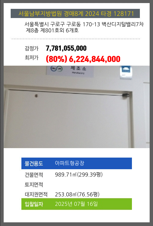 구로아파트형공장경매 구로구 구로동 170-13 벽산디지털밸리7차 제8층 제801호외 6개호 №2024 타경 128171