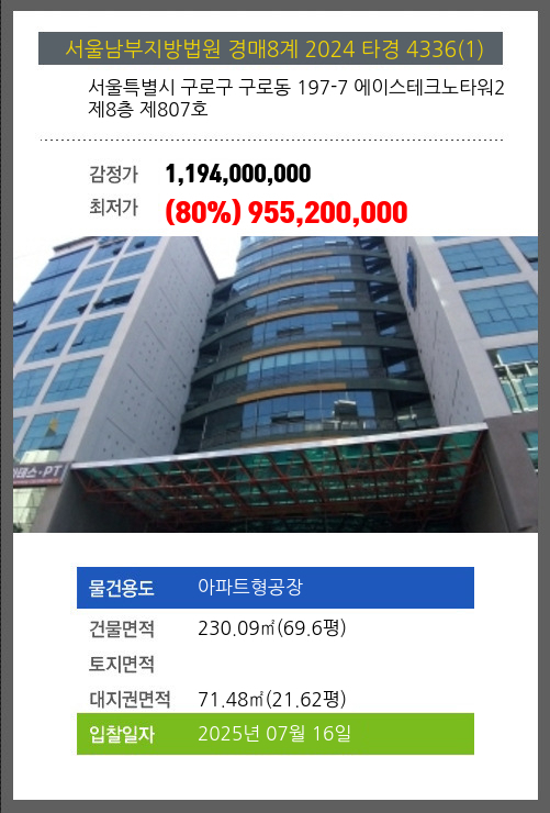 구로아파트형공장경매 구로구 구로동 197-7 에이스테크노타워2 제8층 제807호 №2024 타경 4336(1)