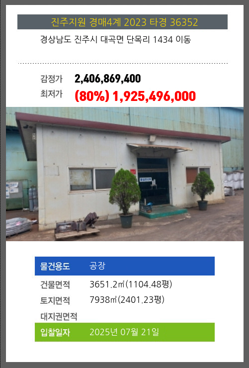| 토지면적 | 7938㎡ (2401.23평) | 소유자 | ㈜** | 보증금 | (10%) 192,549,600 |