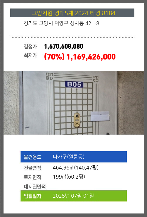 고양다가구(원룸등)경매 고양시 덕양구 성사동 421-8 №2024 타경 8184