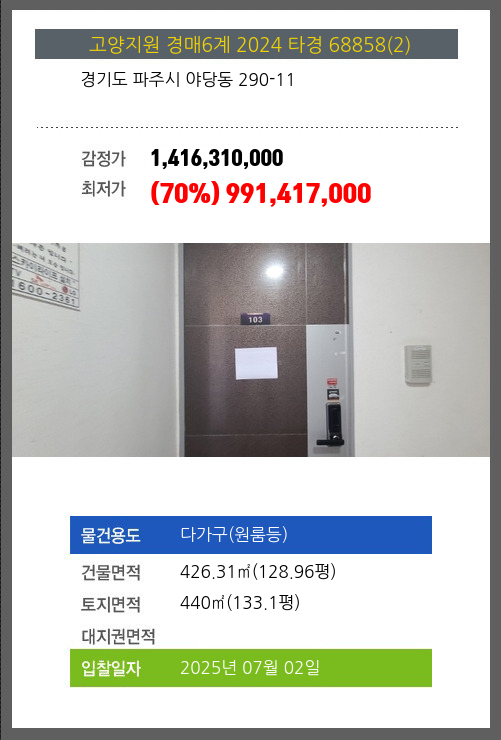 건물면적 426.31㎡ (128.96평) 채무자 정** 최저가 (70%) 991,417,000