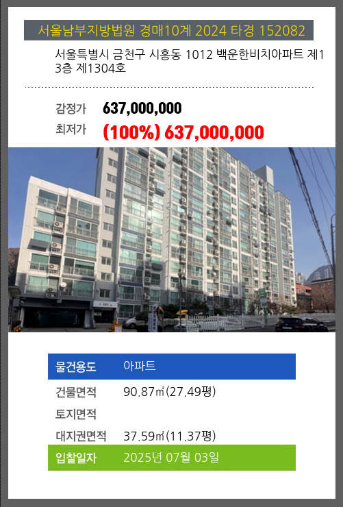 본건은 서울특별시 금천구 시흥동 1012 백운한비치아파트 제13층 제1304호