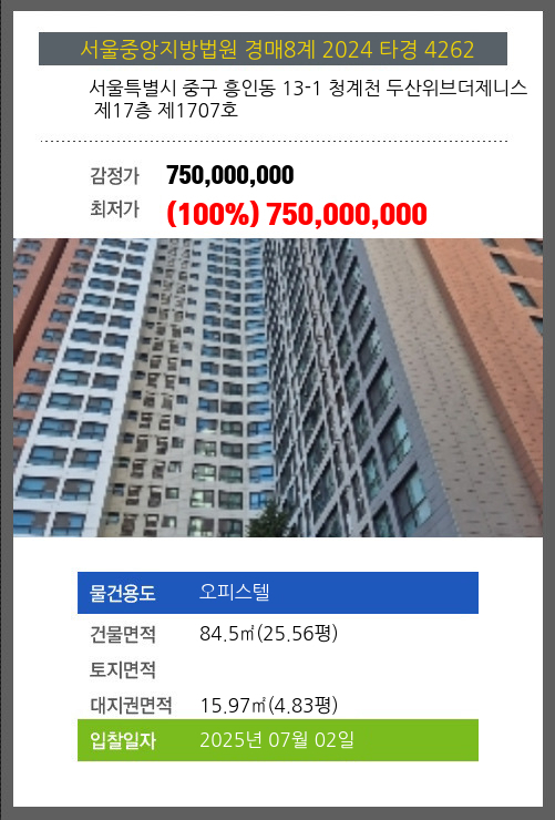 중오피스텔경매 중구 흥인동 13-1 청계천 두산위브더제니스 제17층 제1707호 №2024 타경 4262