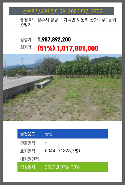 청주공장경매 청주시 상당구 가덕면 노동리 산9-1 주1동외 9필지 №2024 타경 2732
