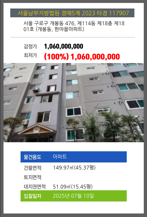 구로아파트경매 구로구 개봉동 476, 제114동 제18층 제1801호 개봉동, 한마을아파트 №2023 타경 117907