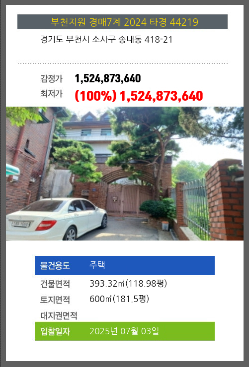 | 건물면적 | 393.32㎡ (118.98평) | 채무자 | 김** | 최저가 | (100%) 1,524,873,640 |