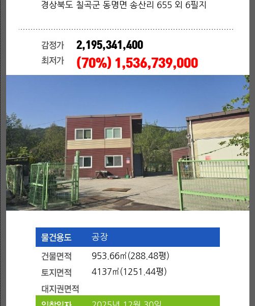 | 용도 | 공장 | 채권자 | ㈜** | 감정가 | 4,421,490,300 |