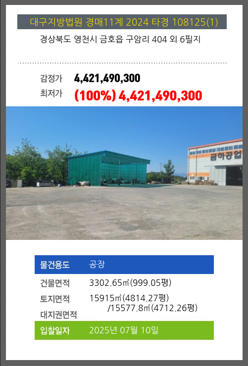 | 건물면적 | 3302.65㎡ (999.05평) | 채무자 | 금** | 최저가 | (100%) 4,421,490,300 |