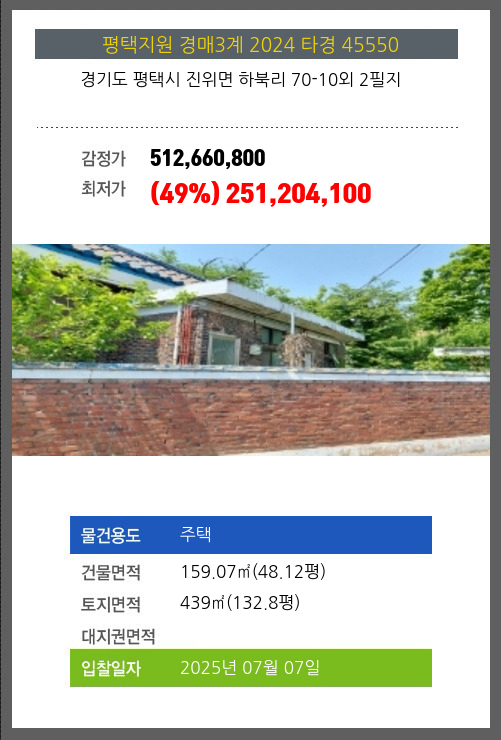 | 토지면적 | 439㎡ (132.8평) | 소유자 | 이** | 보증금 | (10%) 25,120,410 |