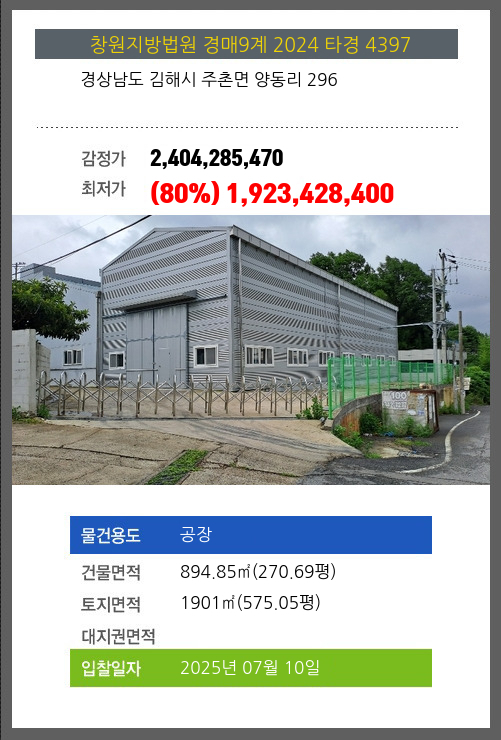 | 용도 | 공장 | 채권자 | ㈜** | 감정가 | 2,404,285,470 |