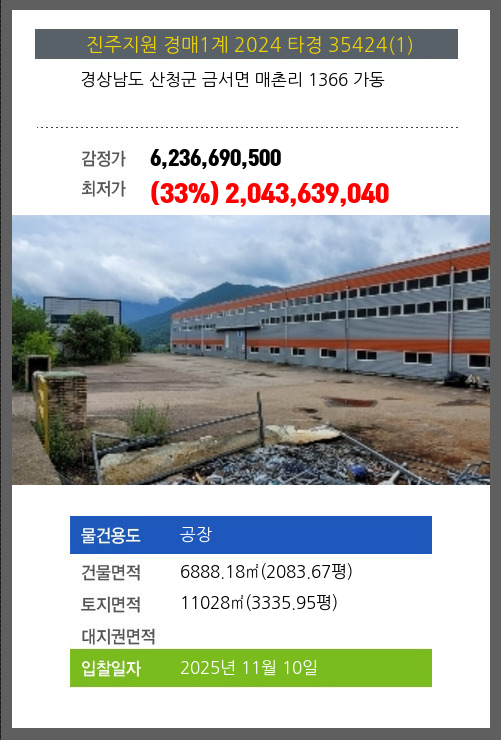 | 건물면적 | 6888.18㎡ (2083.67평) | 채무자 | ㈜** | 최저가 | (33%) 2,043,639,040 |