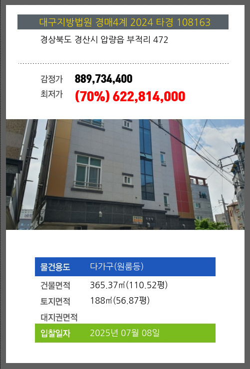 | 용도 | 다가구(원룸등) | 채권자 | 대** | 감정가 | 889,734,400 |