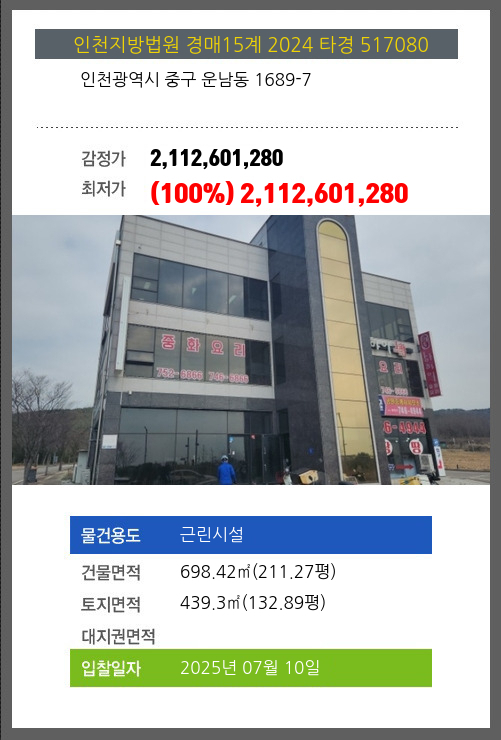 | 건물면적 | 698.42㎡ (211.27평) | 채무자 | 배** | 최저가 | (100%) 2,112,601,280 |