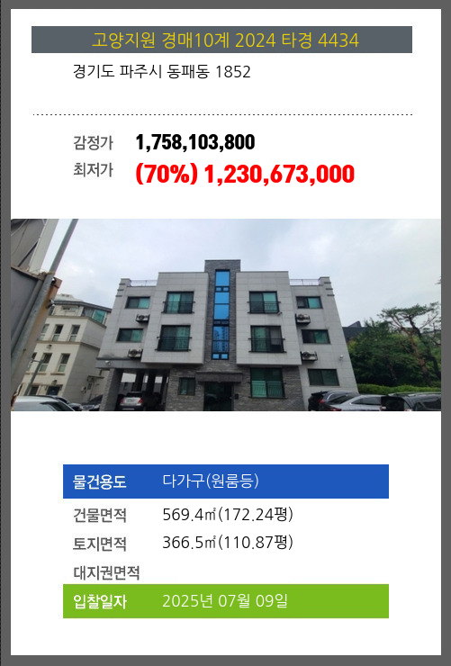 | 건물면적 | 569.4㎡ (172.24평) | 채무자 | 장** | 최저가 | (70%) 1,230,673,000 |