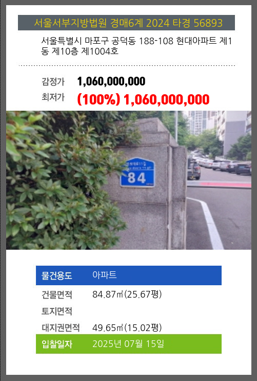 | 건물면적 | 84.87㎡ (25.67평) | 채무자 | 김** | 최저가 | (100%) 1,060,000,000 |