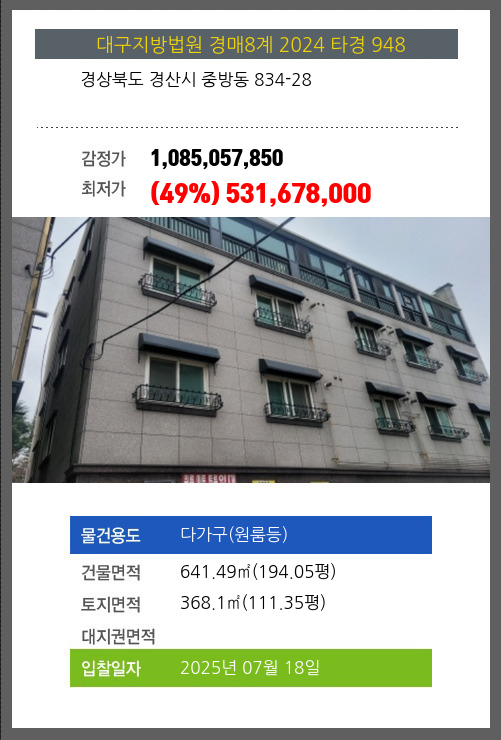 | 건물면적 | 641.49㎡ (194.05평) | 채무자 | 이** | 최저가 | (49%) 531,678,000 |