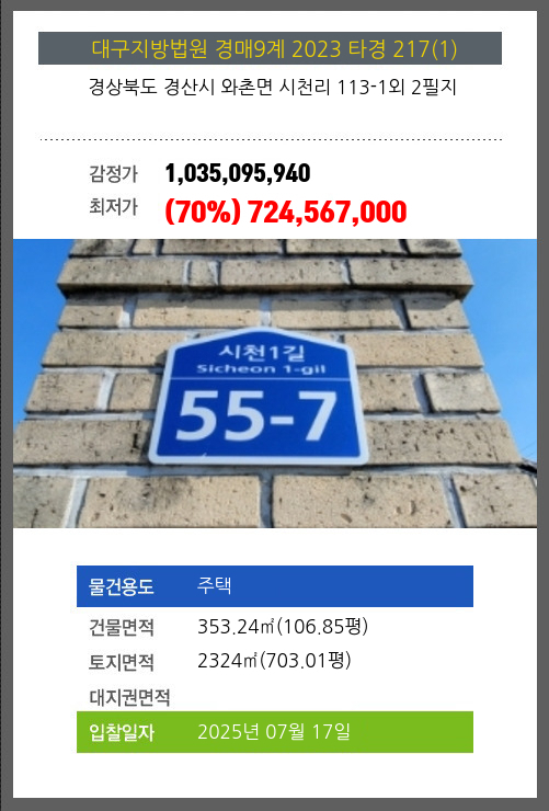 | 건물면적 | 353.24㎡ (106.85평) | 채무자 | 안** | 최저가 | (70%) 724,567,000 |