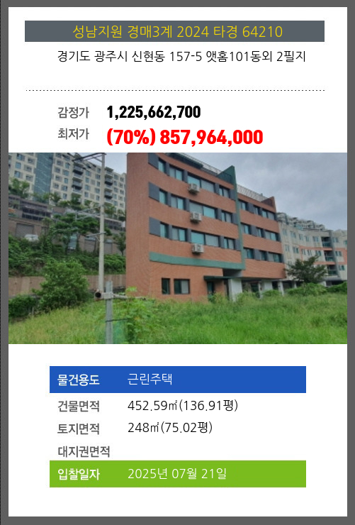 | 건물면적 | 452.59㎡ (136.91평) | 채무자 | 이**외1명 | 최저가 | (70%) 857,964,000 |