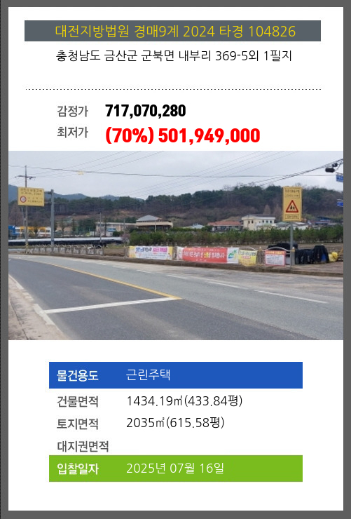 | 건물면적 | 1434.19㎡ (433.84평) | 채무자 | 농** | 최저가 | (70%) 501,949,000 |