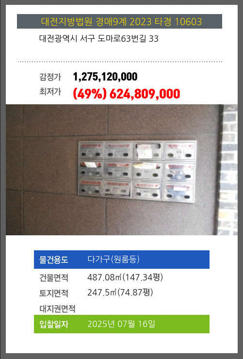 | 용도 | 다가구(원룸등) | 채권자 | 대** | 감정가 | 1,275,120,000 |