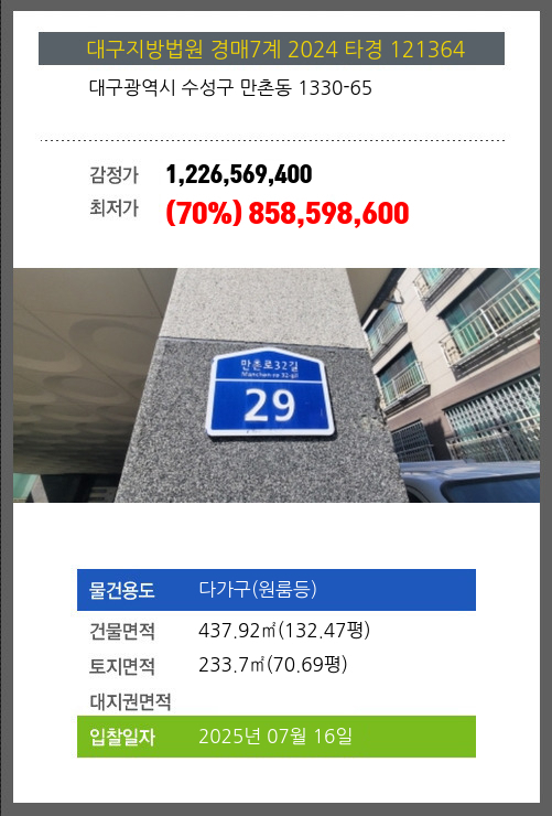 | 건물면적 | 437.92㎡ (132.47평) | 채무자 | 최** | 최저가 | (70%) 858,598,600 |