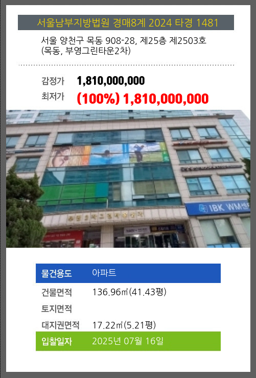 본건은 서울 양천구 목동 908-28, 제25층 제2503호 (목동, 부영그린타운2차)
