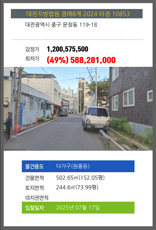 | 매각대상 | 공시가격3~4억 | 경매종류 | 강제경매 | 사건접수일 | 2024-11-05 |
