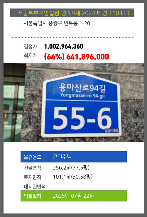 | 건물면적 | 256.2㎡ (77.5평) | 채무자 | 홍** | 최저가 | (64%) 641,896,000 |