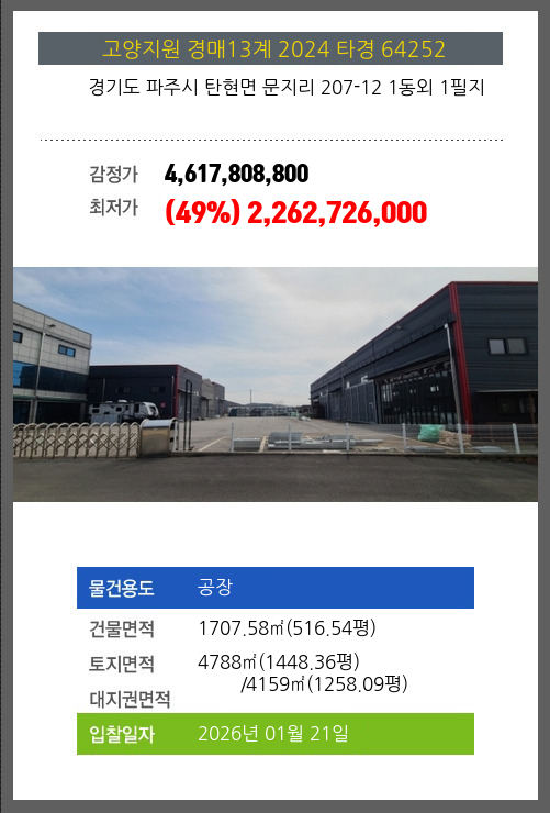 | 용도 | 공장 | 채권자 | 중** | 감정가 | 4,617,808,800 |