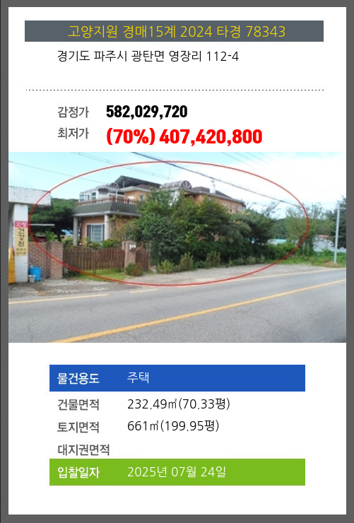 | 용도 | 주택 | 채권자 | 고** | 감정가 | 582,029,720 |