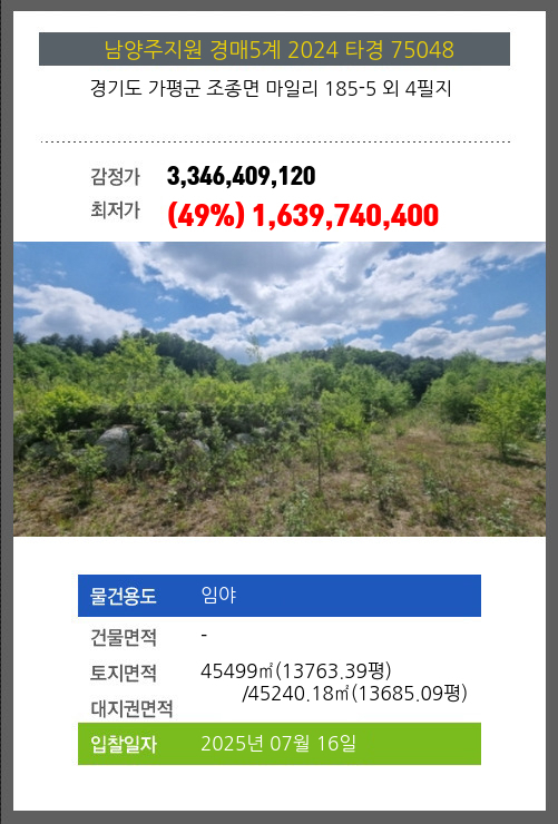 가평임야경매 가평군 조종면 마일리 185-5 외 4필지 №2024 타경 75048