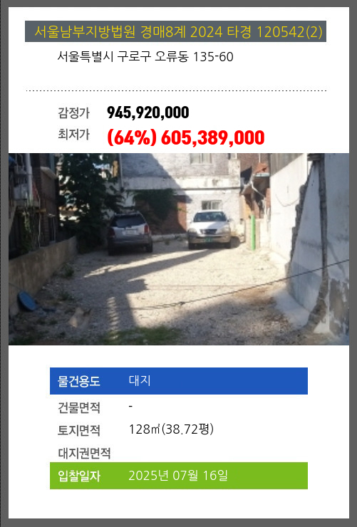 | 토지면적 | 128㎡ (38.72평) | 소유자 | ㈜** | 보증금 | (10%) 60,538,900 |