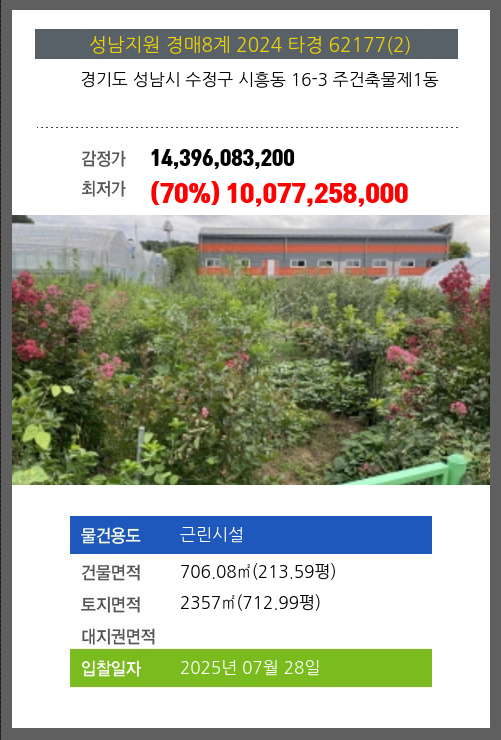 | 건물면적 | 706.08㎡ (213.59평) | 채무자 | 효** | 최저가 | (70%) 10,077,258,000 |