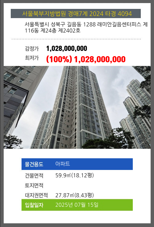 본건은 서울특별시 성북구 길음동 1288 래미안길음센터피스 제116동 제24층 제2402호