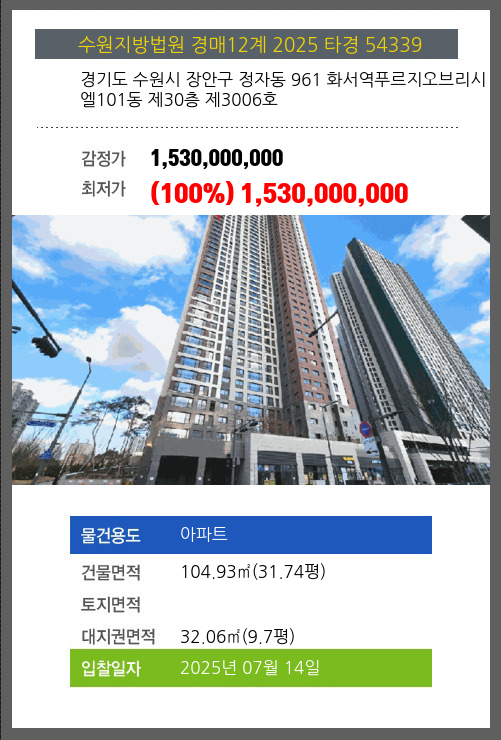 본건은 경기도 수원시 장안구 정자동 961 화서역푸르지오브리시엘101동 제30층 제3006호