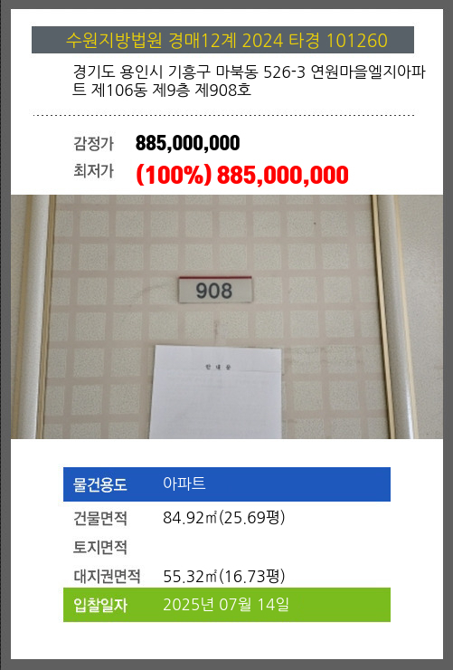 본건은 경기도 용인시 기흥구 마북동 526-3 연원마을엘지아파트 제106동 제9층 제908호