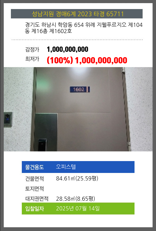 본건은 경기도 하남시 학암동 654 위례 지웰푸르지오 제104동 제16층 제1602호