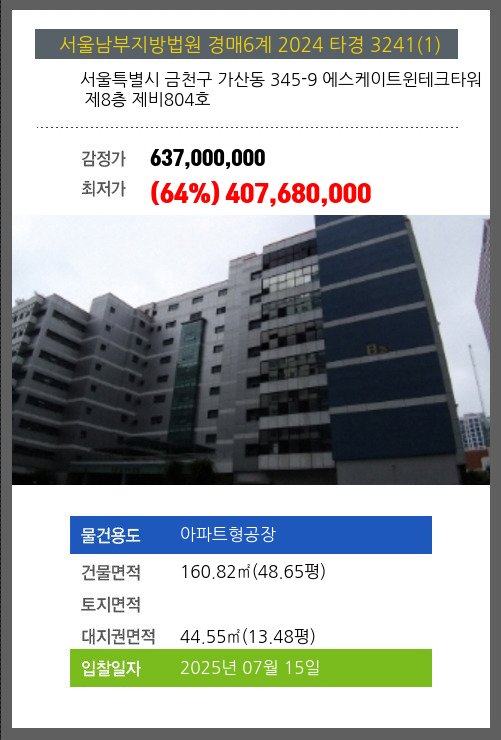 본건은 서울특별시 금천구 가산동 345-9 에스케이트윈테크타워 제8층 제비804호