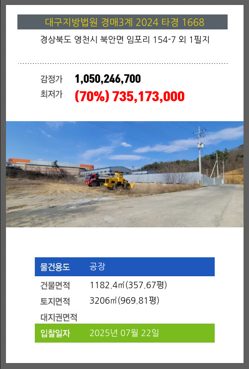 | 소재지 | [지번] 경상북도 영천시 북안면 임포리 154-7 외 1필지 [도로명 주소] 경상북도 영천시 북안면 대경로 2630-39 |