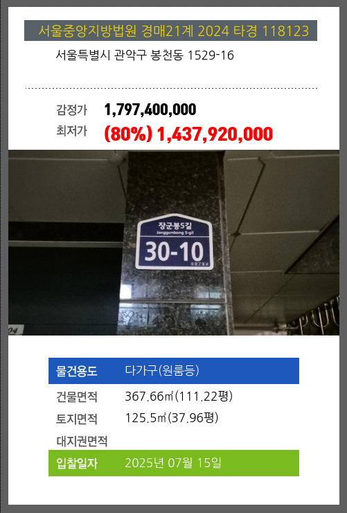 관악다가구(원룸등)경매 관악구 봉천동 1529-16 №2024 타경 118123
