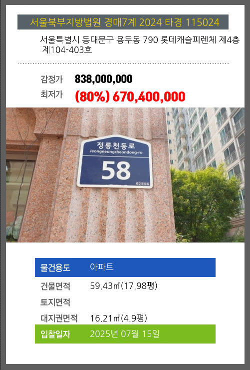 본건은 서울특별시 동대문구 용두동 790 롯데캐슬피렌체 제4층 제104-403호