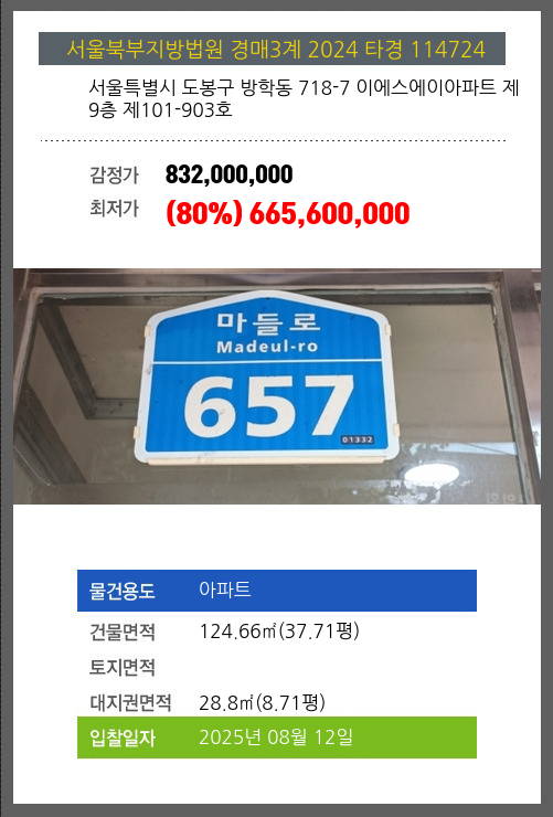 | 소재지 | [지번] 서울특별시 도봉구 방학동 718-7 이에스에이아파트 제9층 제101-903호 [도로명 주소] 서울특별시 도봉구 마들로 657 이에스에이아파트 제9층 제101-903호 |