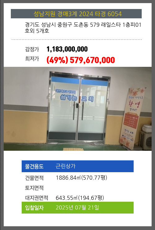 성남상가경매 성남시 중원구 도촌동 579 래일스타 1층피01호외 5개호 №2024 타경 6054