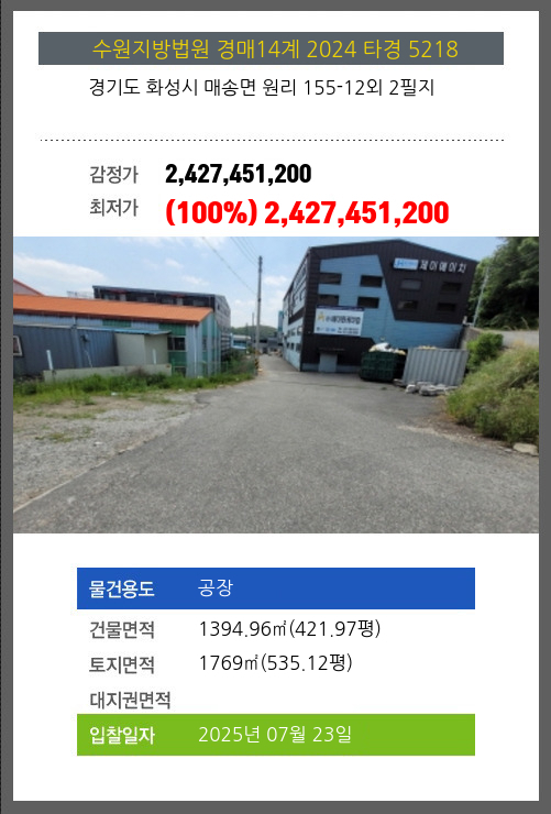 | 용도 | 공장 | 채권자 | ㈜** | 감정가 | 2,427,451,200 |