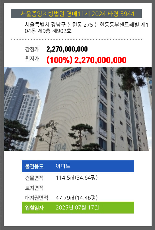 | 건물면적 | 114.5㎡ (34.64평) | 채무자 | 이**외1명 | 최저가 | (100%) 2,270,000,000 |