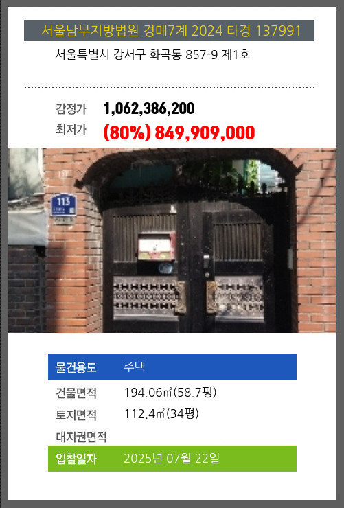 | 건물면적 | 194.06㎡ (58.7평) | 채무자 | 원** | 최저가 | (80%) 849,909,000 |